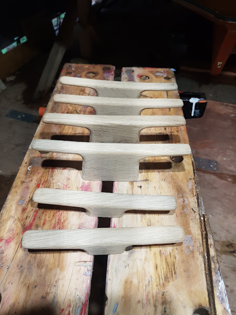 Maalaustöiden valmistuttua tältä erää ryhdyin valmistamaan knaapeja veneeseen. Näitä tarvittaisiin kuusi kappaletta. Kaksi maston molemmin puolin keulalaipioon kiintettyinä ja yksi knaapi perän molemmin puolin skantäkin päälle kiinnitysköysiä varten. Laipioon tulevissa knaapeissa, johtuen niiden sijoituksesta paksun jalavalistan alapuolelle, pitää rungon korkeus olla 60 cm luokkaa, jotta nostinköydet mahtuu hyvin kiertämään knaapeihin.